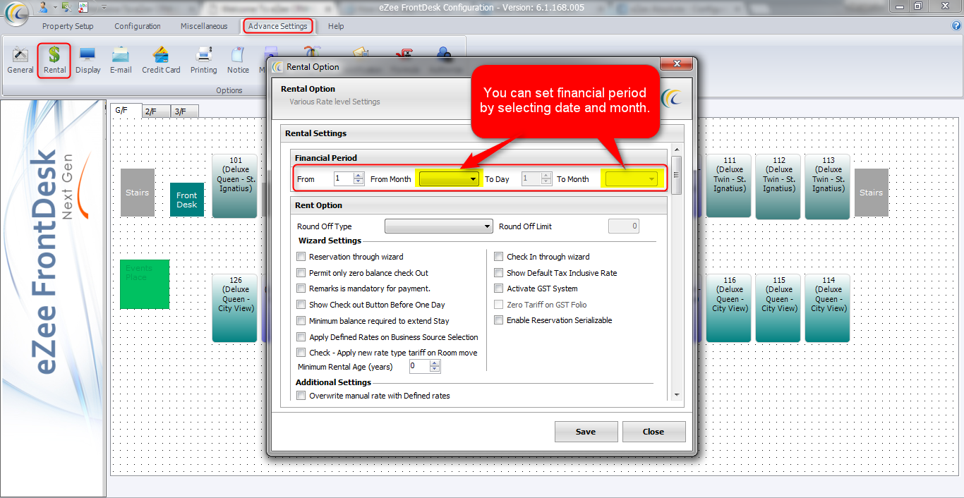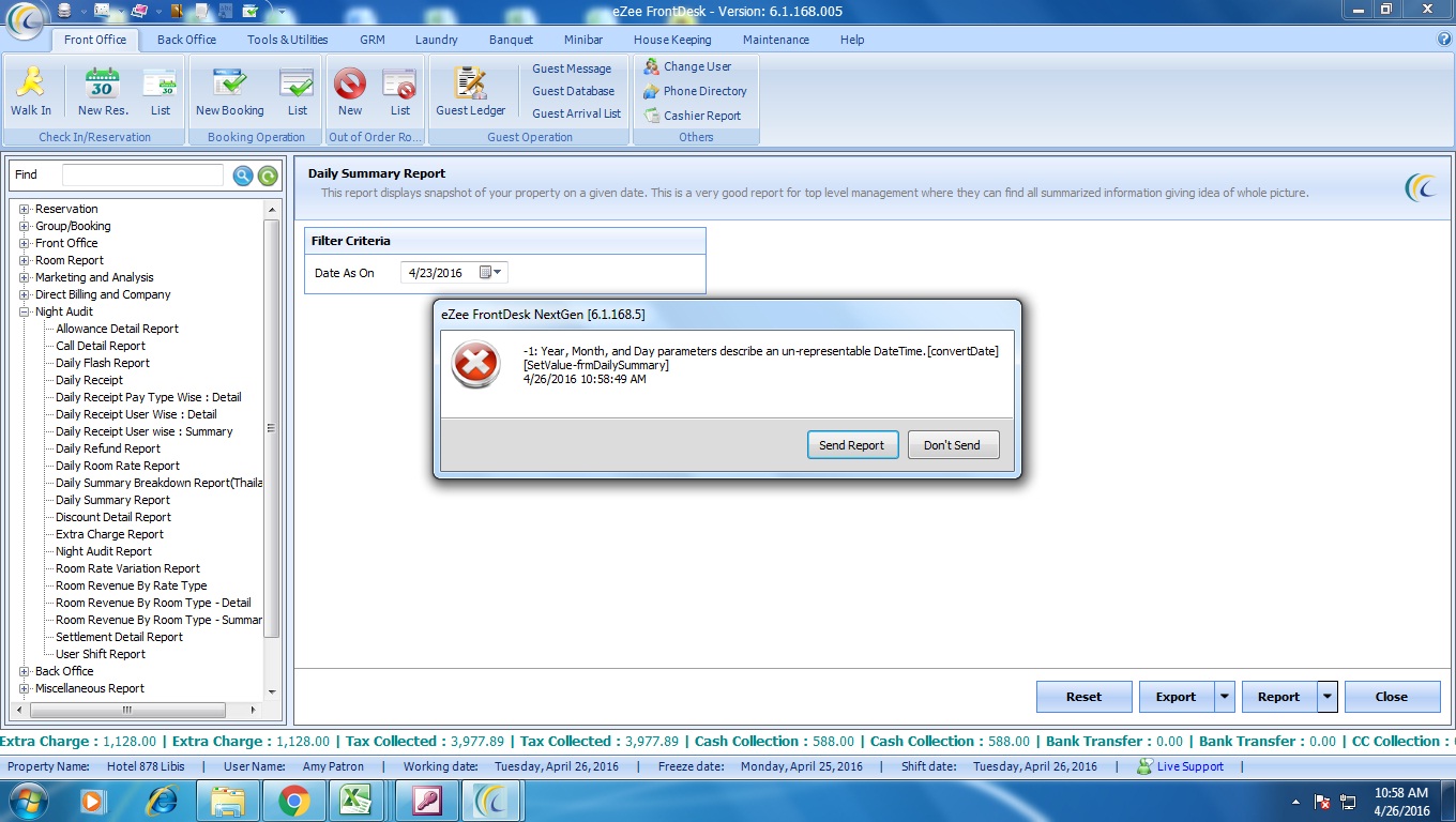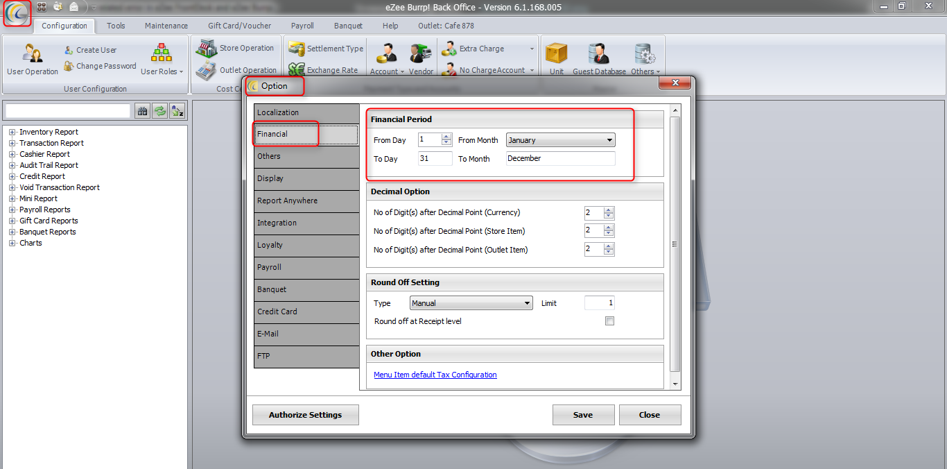 If you face below error message related to report preview in eZee FrontDesk OR eZee Burrp anytime, Kindly set financial period from eZee Configuration and eZee POS Back Office. It will resolve this error.