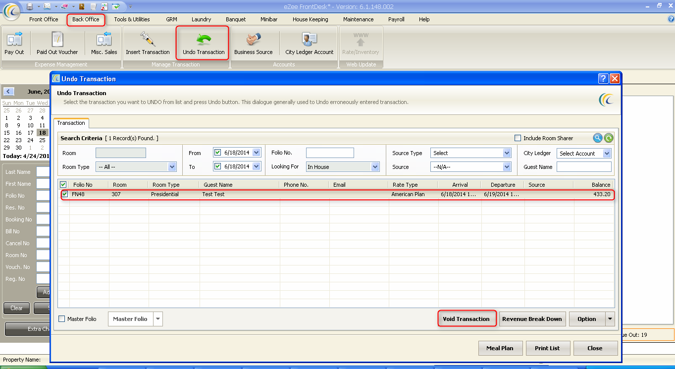 eZee front desk>>Back office tab>>Undo Transaction tab >>Void Transaction.