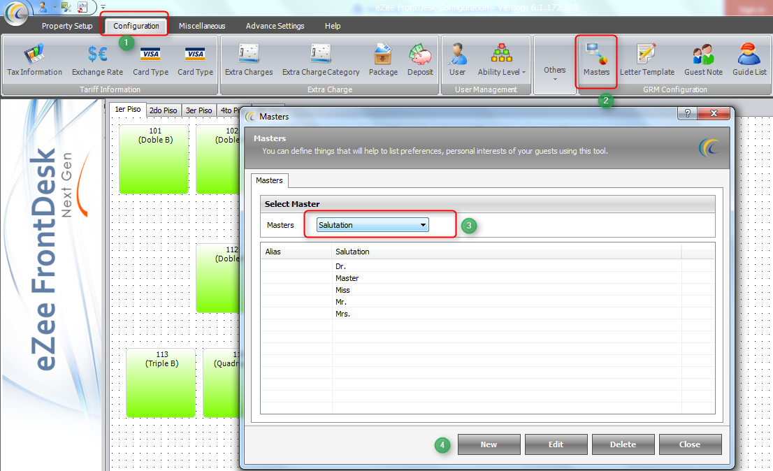 Path: eZee Frontdesk Configuration >> Configuration (Tab) >> Master >> Select "Saluation" from the drop down >> New (Define Saluation) >> Save.