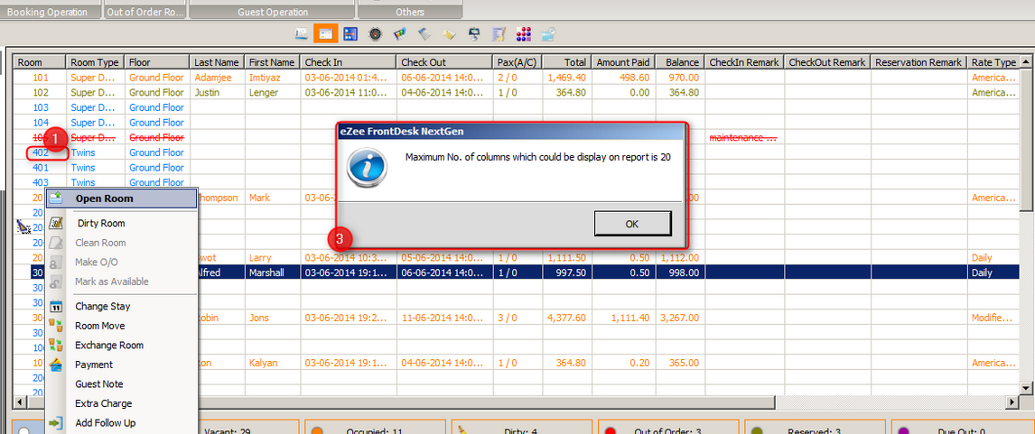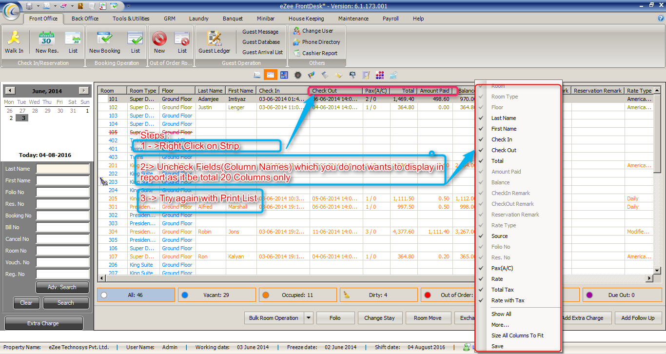 2. Uncheck Column Name's those are not required/empty. Reason: Room List can only be printed with 20 columns in row.