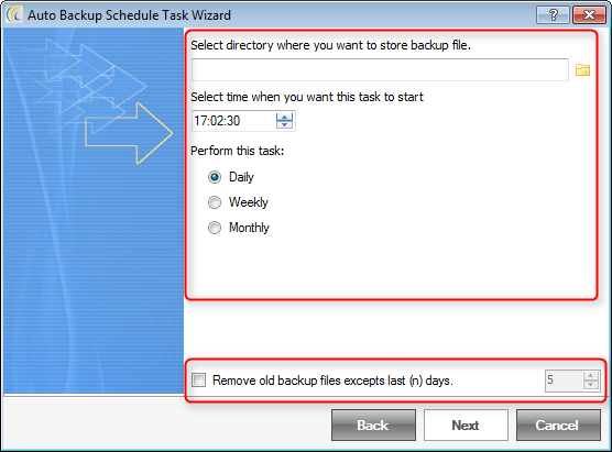 2) Set the folder for database backup to be stored. 3) After how many days you want to delete the previous database backups.