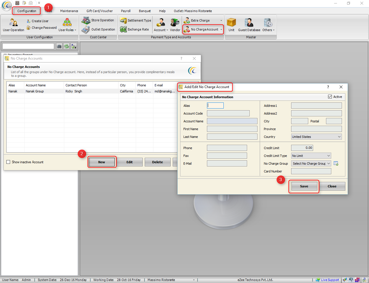 For Creation of Staff account Open POS Back Office >> Configuration Tab >> Select No Charge Account.