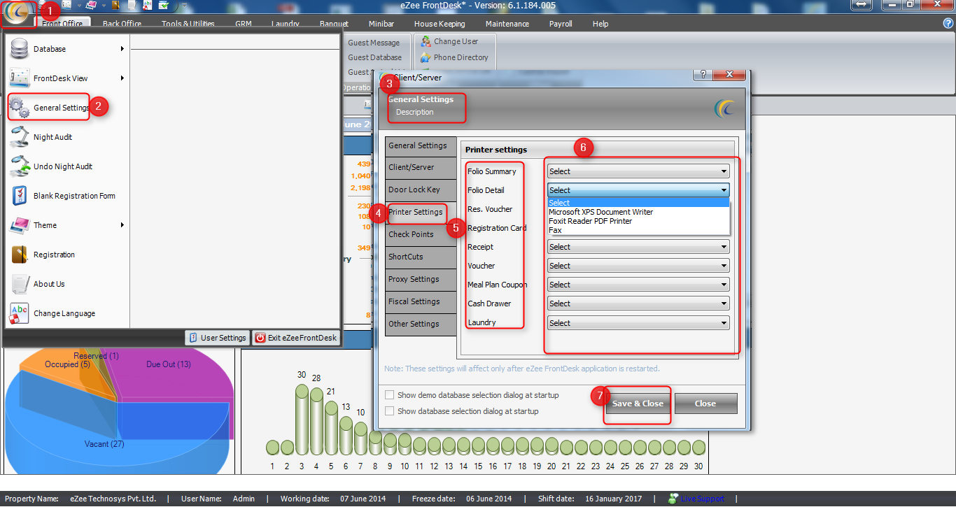 3) Open eZee Frontdesk and Click on eZee Logo >> General Settings >> Check Printer is set there or not.